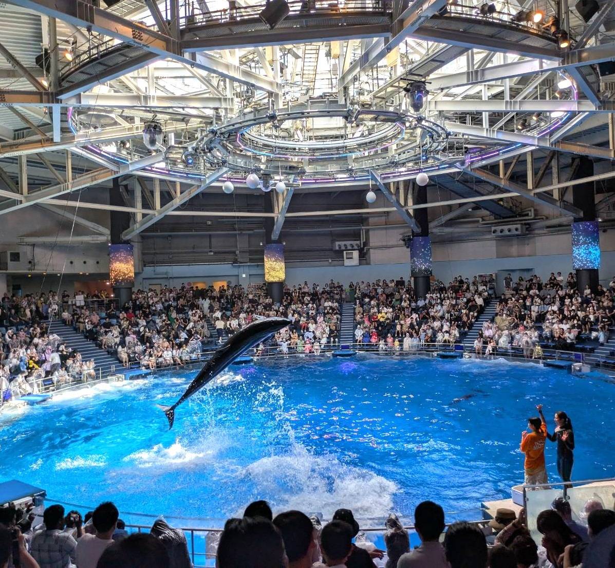 イルカショーは大迫力で前方の席の人は