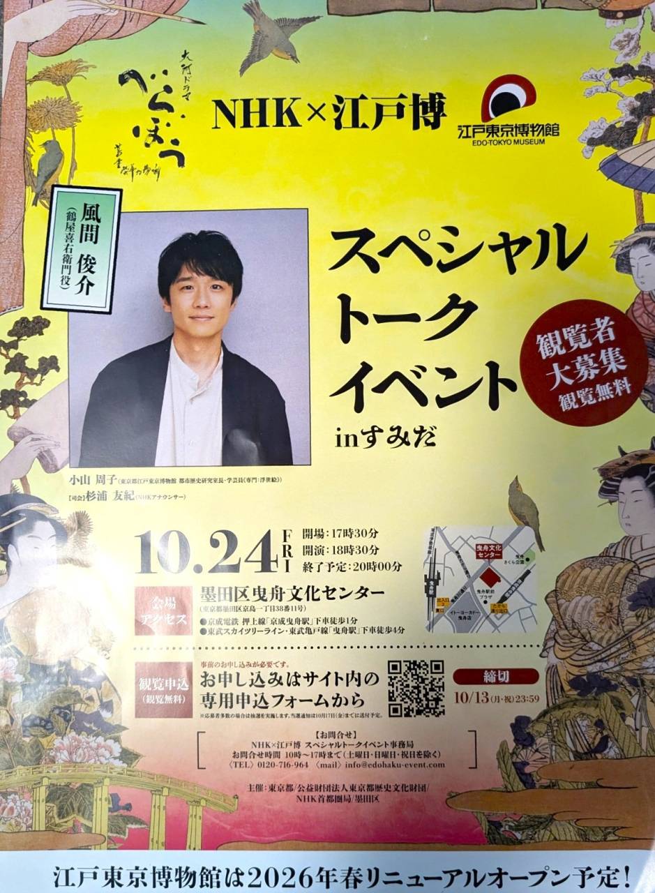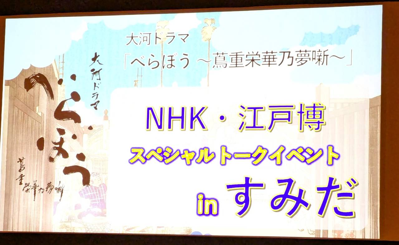 2025年12月11日 大河ドラマ『べらぼう』スペシャルト-クイベント 10月24日 墨田区曳舟文化センタ- 12月14日最終回放送予定の『べらぼう』 応募総数4,000人以上のなか当選しました🎯 ゲスト 鶴屋喜右衛門役 風間俊介さん 勝川春章役 前野朋哉さん 司会 NHKアナウンサー 杉浦友紀さん 三部構成で、一部 撮影秘話 二部 ミニコンサ-ト(劇中音楽ピアノ演奏とコーラス) 三部 最終話むけての展望 風間さんは墨田区出身 この場所でト-クイベントが出来ることが 感慨深く沢山の方に作品が愛されている事が 嬉しく思います 前野さんは『あそーれ!屁!屁!』と叫びながら 踊るシ-ンが大変だったそうです 時間が押して夜中の撮影 狭いセットで大人数が踊ったのでOKが 出たとき出演者はフラフラだったそうです 風間さんは浅間山噴火の灰掃除 蔦重と争うとき高下駄をはいて走った事 身上半減の際、鶴屋が贈った暖簾を 半分に切られ残念と・・・・ 最終話の台本は読んできました こんな結末になるんだと言ってました 大人の事情で話せませんか゛ 最終回日曜夜8時より放送予定 是非ご覧ください 経営企画本部 総務G S・I